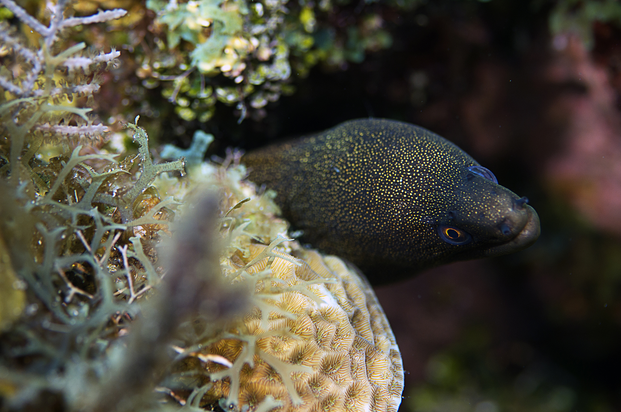 Golden Spotted Moray Eel Posted on August 13, 2019August 13, 2019 by J.T. Lewis ← Previous Next → A golden spotted moray eel in the wild in Roatan, Honduras. There are a few names for this eel including golden tail moray eel and spotted moray eel.